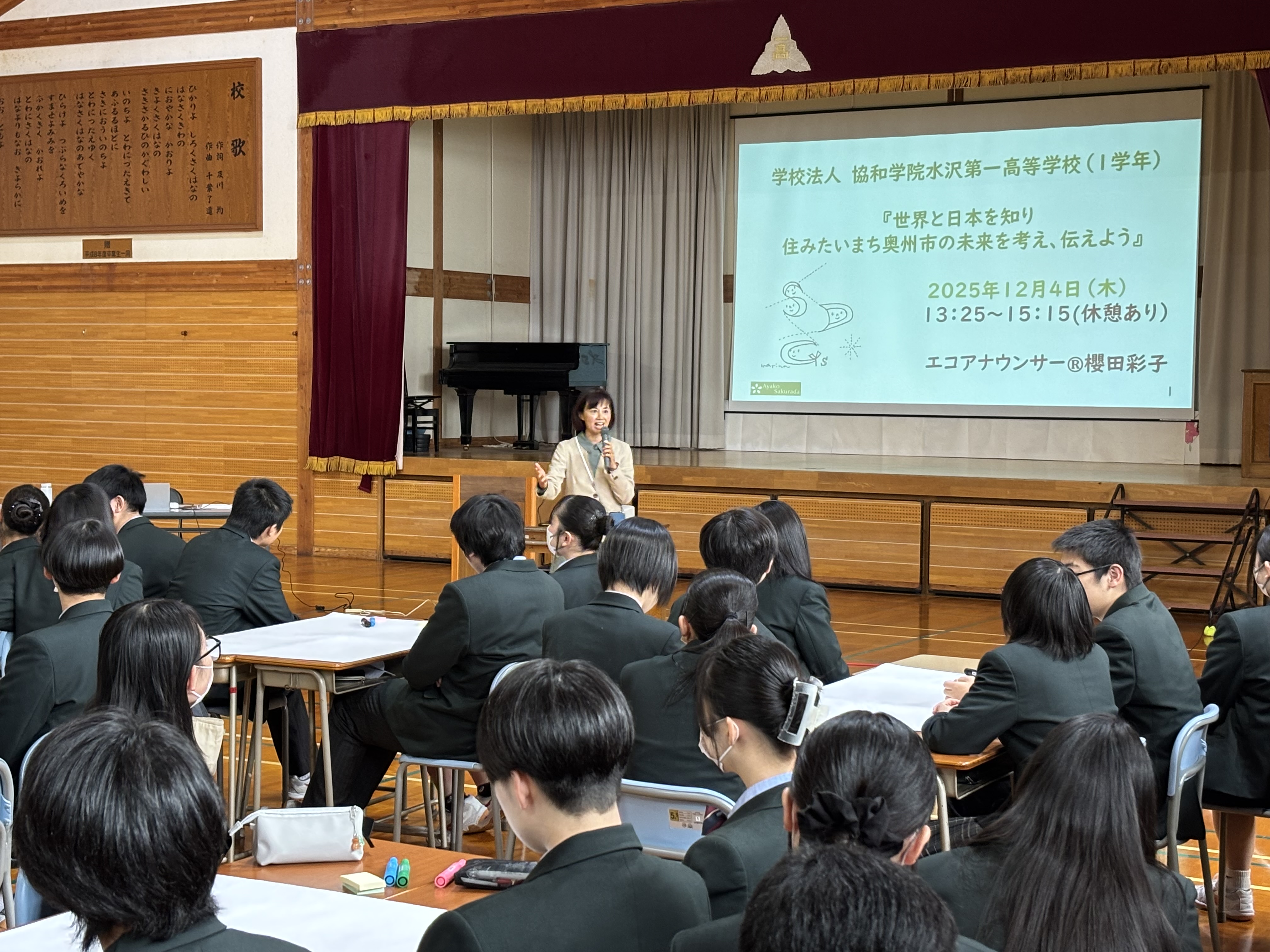 12月4日(木)1年生を対象とした環境学習会を実施しました。「世界と日本を知り、住みたいまち奥州市の未来を考え、伝えよう」とのタイトルから、エコアナウンサーの櫻田彩子さんからご講演をいただき、その後班ごとに環境とまちの持続可能性をつなげ「こんな奥州市にしたい!」を考えました。 企画、運営していただいた奥州市生活環境課、GX推進室、アジア航測(株)、めぐみネットの皆さん、ありがとうございました。