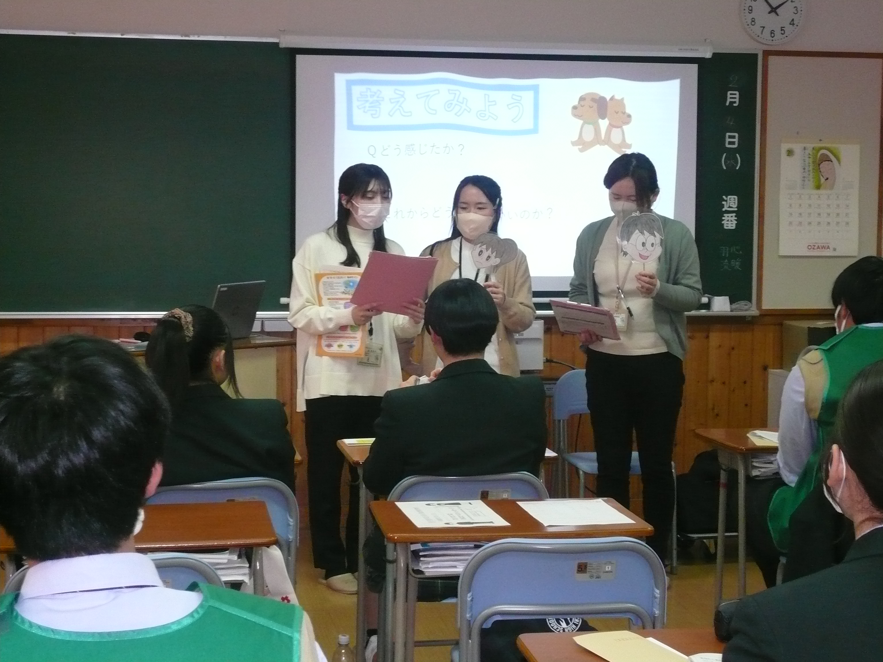 2月2日と5日の2日間、1年生4クラスで奥州市の保健師さんを講師にお招きし「思春期保健講話」を実施しました。 妊婦体験や赤ちゃん人形の抱っこ体験を通じて、命の大切さやこれからの自分の人生を真剣に考える機会となりました。